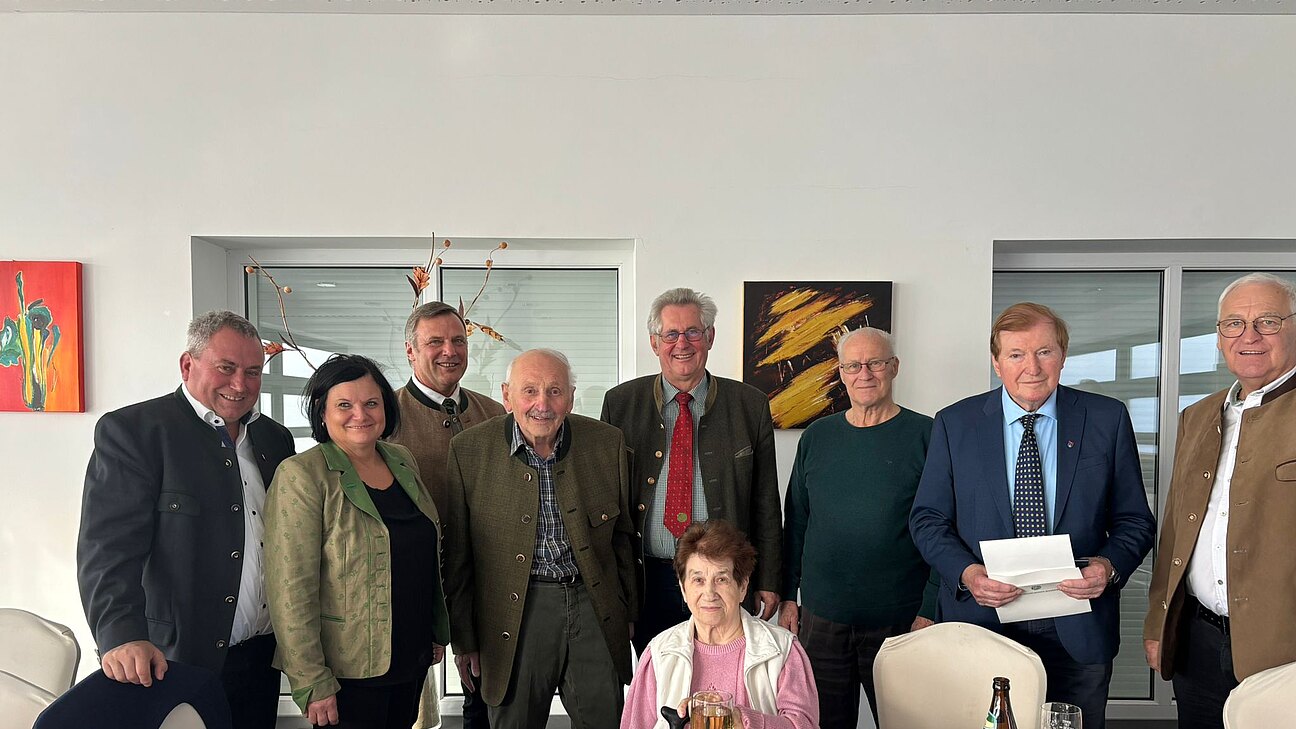 Bürgermeister Bernhard Karnthaler mit Gattin Martina, Obmann Hannes Fingerlos, Jubilar Franz Breitsching, BR a.D. Martin Preineder, Jubilarin Erika Riedl, Jubilare Franz Neubauer, Manfred Grimm und Alois Rodler. Nicht am Bild: Jubilar Julius Steiner. Herzlichen Glückwunsch!