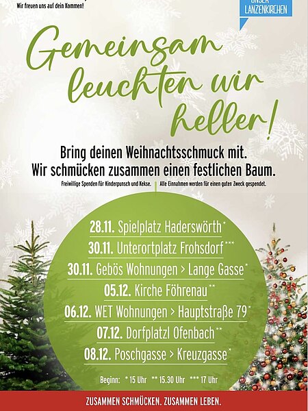 unter dem Motto "gemeinsam leuchten wir heller" werden vom Bürgermeister-Team auch heuer wieder mit den Familien und Kindern aus Lanzenkirchen in den jeweiligen Ortsteilen Christbäume festlich geschmückt